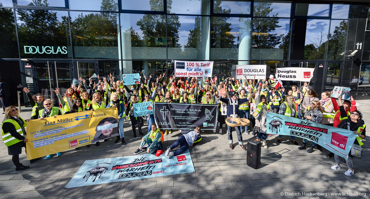 Douglas Mitarbeiterinnen aus ganz Deutschland demonstrieren vor der Douglas Zentrale für einen Tarifabschluss und gegen Geschäftsschließungen in Düsseldorf am 01.10.2021. Foto Dietrich Hackenberg