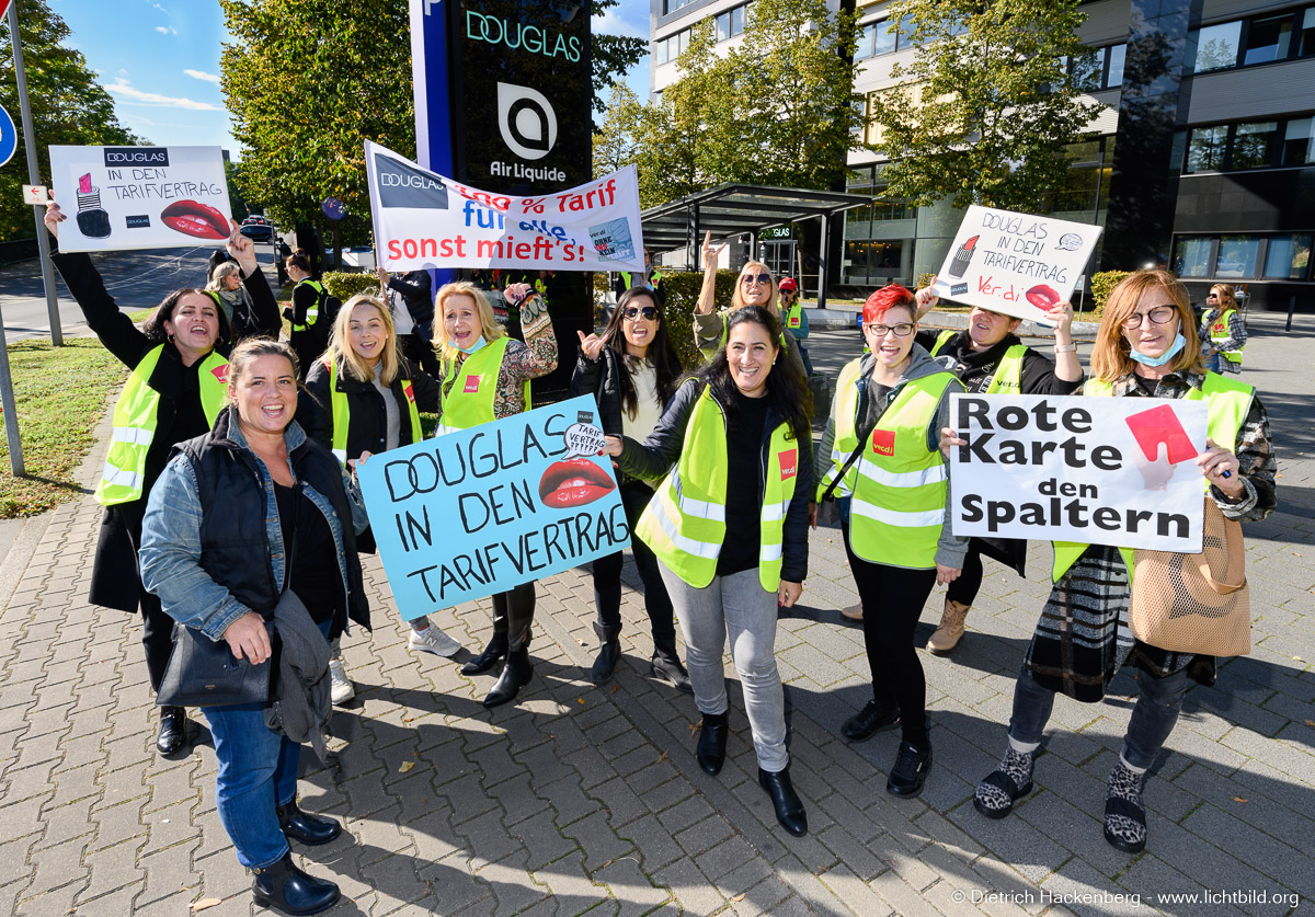Douglas Mitarbeiterinnen aus ganz Deutschland demonstrieren vor der Douglas Zentrale für einen Tarifabschluss und gegen Geschäftsschließungen in Düsseldorf am 01.10.2021. Foto Dietrich Hackenberg